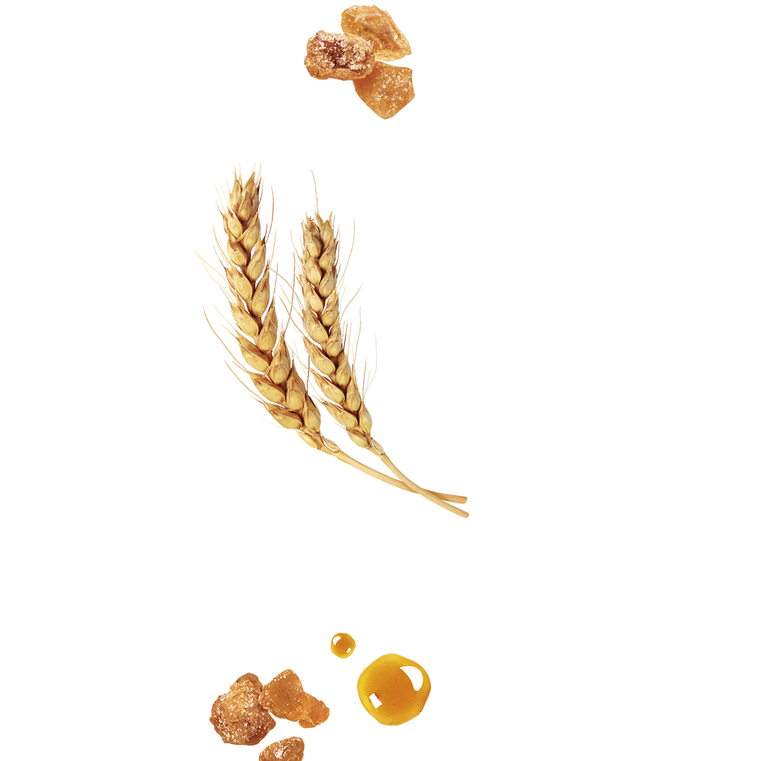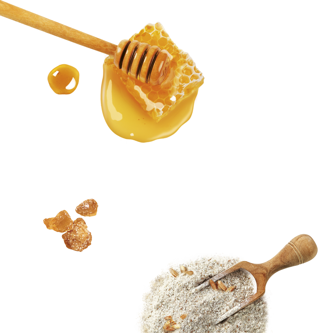La forma del cartiglio, rivisitata per questo prodotto, valorizza il design storico del frollino, mentre miele, farina e zucchero di canna, che volano nello spazio, sprigionano un gusto autentico e senza tempo.
