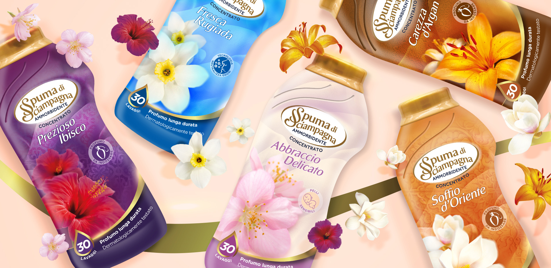 Il vortice viene reinterpretato per ciascuna categoria e referenza: più energico per il lavaggio in lavatrice, più delicato per il bucato a mano, garantendo unicità e coerenza visiva.